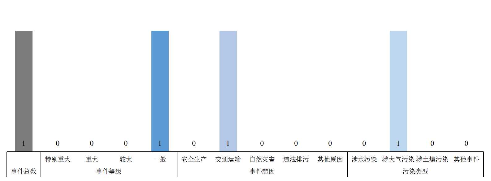2025年4月—6月,全省各级生态环境部门共参与处置突发环境事件1起,与去年同期持平。按事件等级分:该起事件为一般突发环境事件。按事件起因分:该起事件为交通运输事故次生的突发环境事件。按事件类型分:该起事件为涉大气污染事件。