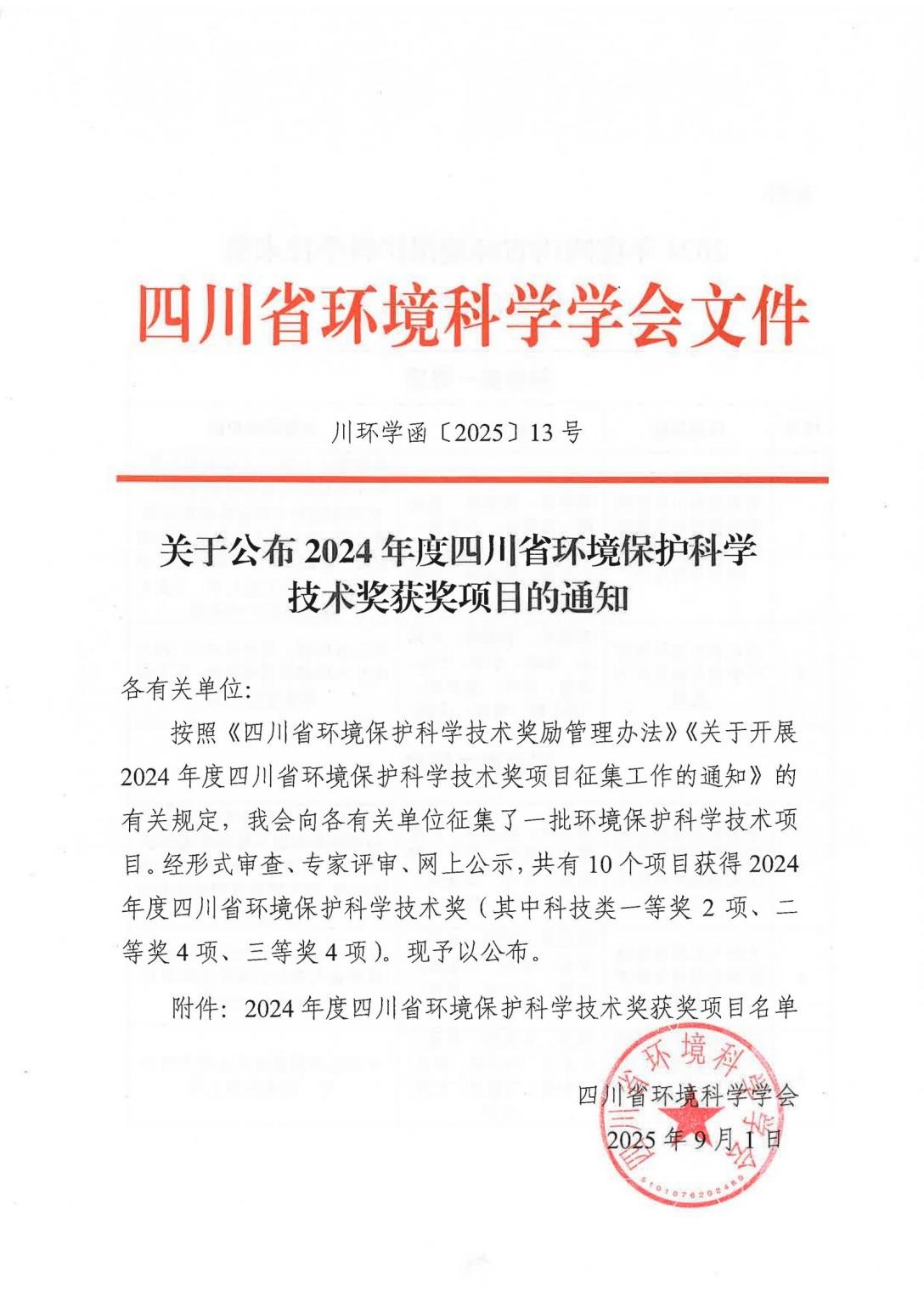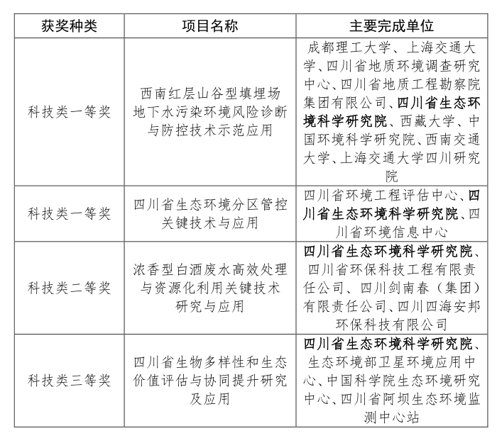 喜报!我院4个项目荣获2024年度四川省环境保护科学技术奖