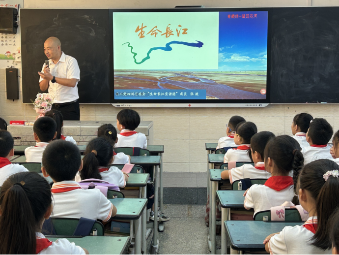 课堂上,主讲老师化身“环保导游”,用生动形象的语言带领学生们开启“长江生态之旅”。通过精美的图片和视频,从三江源头的壮美景色讲到沿岸风土人情,再结合真实案例,深入浅出地剖析了资源过度开发、水体污染、气候变化等环境问题的成因及危害。孩子们专注聆听,真切感受到保护长江的紧迫性和重要性。