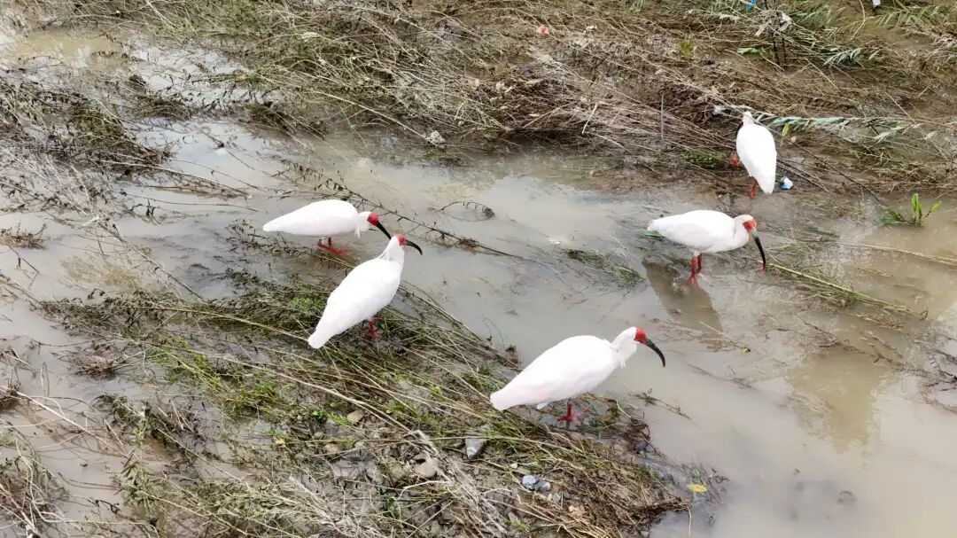 5只朱鹮均披着一身白羽,头部和双脚呈橘红色,它们时而低空飞行,时而结队觅食,“酒足饭饱”后就在河边的树枝上栖息。似乎知道人们都不会有恶意一样,他们对于无人机的近距离拍摄,不但丝毫不怯场,还全程配合,在附近逗留了近半个小时后才离开。“一开始还以为是白鹭,走进一点才发现是朱鹮。”杨树操感叹道,能够拍到被誉为“吉祥鸟”的朱鹮,的确太幸运了!