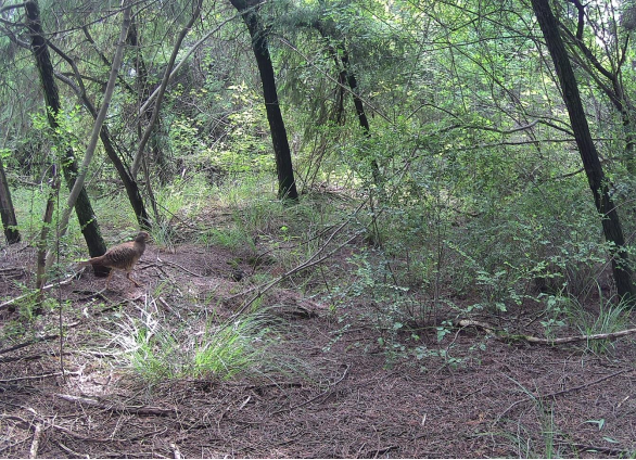 而早在8月初,布设于同一监测样地人工林内的红外相机已悄然“上岗”:一只红腹锦鸡雌鸟从灌丛中走出,羽色以棕褐色为主,缀有黑褐色斑点,虽不似雄鸟那般艳丽,却自带低调的自然美感。它警惕地环顾四周,轻盈的脚步踩在落叶上几乎无声,尽显野生鸟类的灵动与机警。